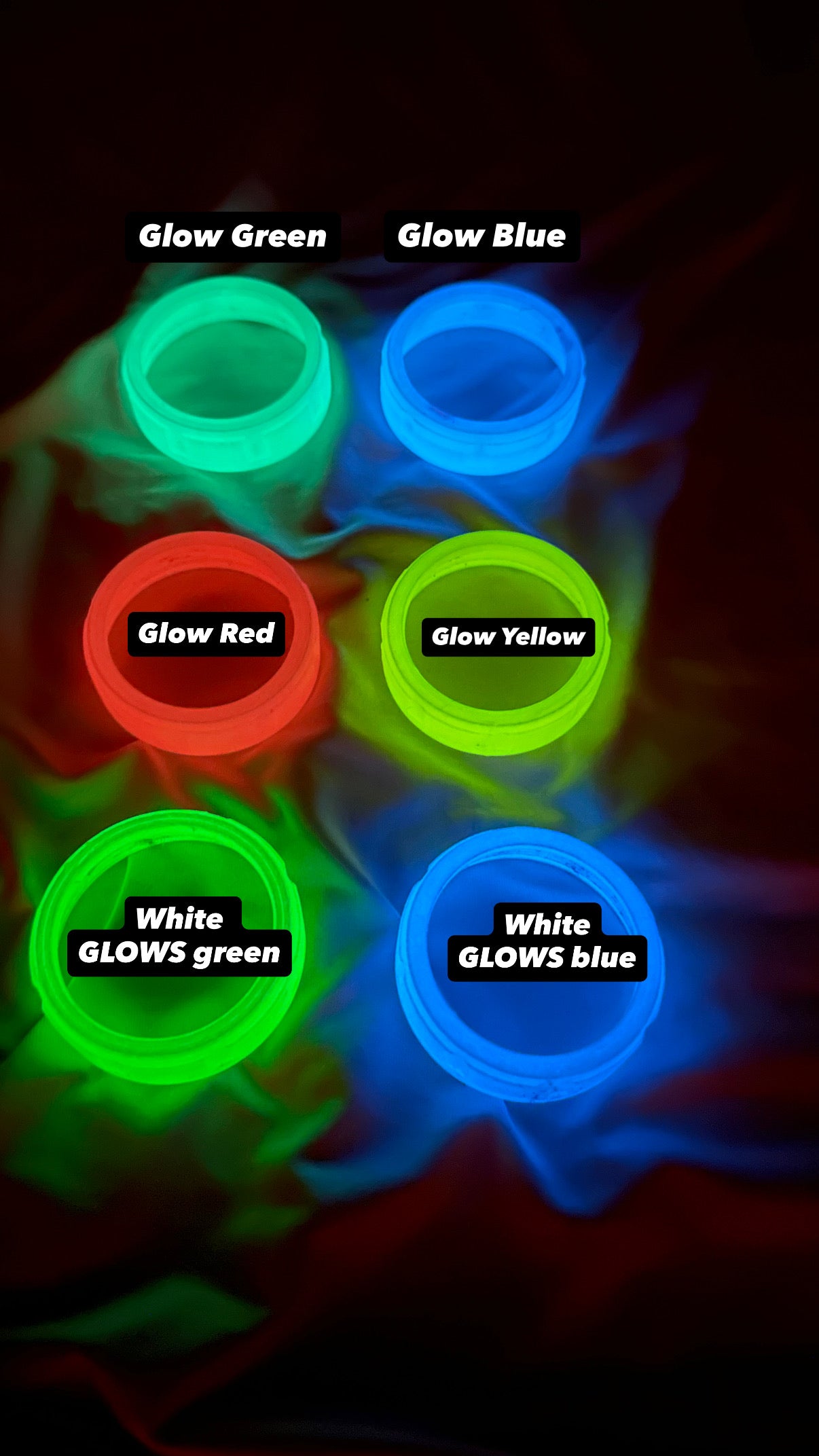 Comes in glowing and non glowing colors. As with all glowing materials, it needs to be subjected to adequate light before glowing (UV light is the best). All colors do not glow equally, some glow MUCH better than others. Glow strength is listed below from strongest to weakest