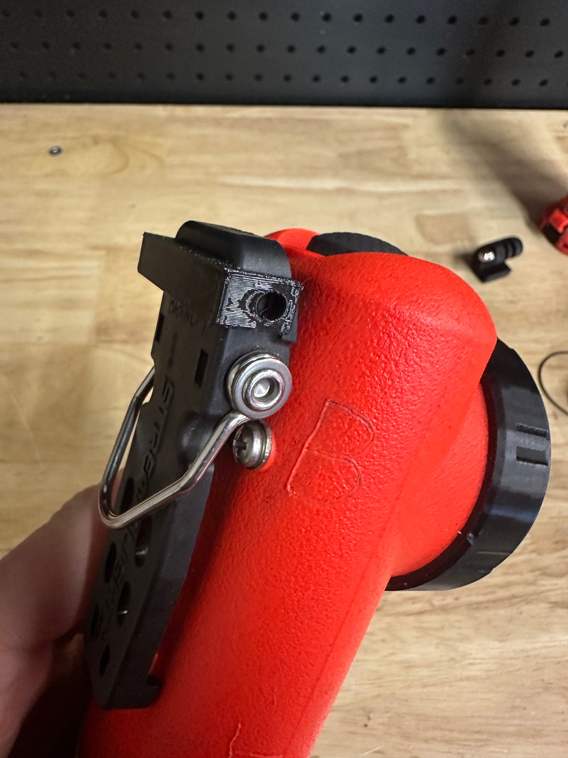 This GoPro mount attaches to the rectangular hole at the top of your Streamlight Survivor light clip. It works with the newer LED and older style survivor lights. These mounts require drilling a hole through the clip (a drill template/guide is provided in the kit making install fireman-proof - takes less than a minute to install).